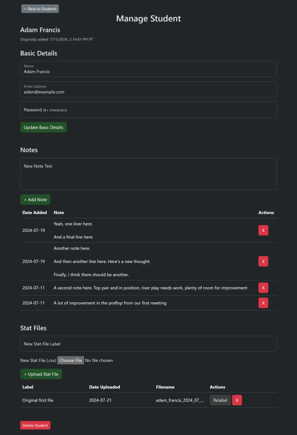 This was a perfect case for a full-stack web app. Admins can manage students; students can log in and view extremely detailed analyses of their hands.
